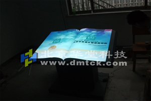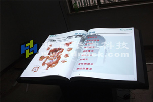 此套虚拟翻书为投影机实现方式,高流明三菱工程用投影机, 75*100cm白色胶版书模,外形形象,美观大方,造型台为银色,高度70cm,和整个展厅极为搭配,标准服务器配置,翻书效果设计制作。